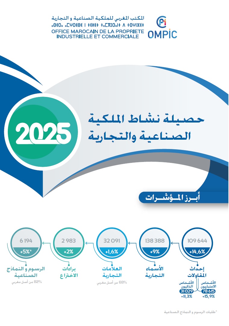 ينهي المكتب المغربي للملكية الصناعية والتجارية إلى علمكم أن نشرة الملكية الصناعية والتجارية لسنة 2025 متاحة عبر الرابط : النشرة